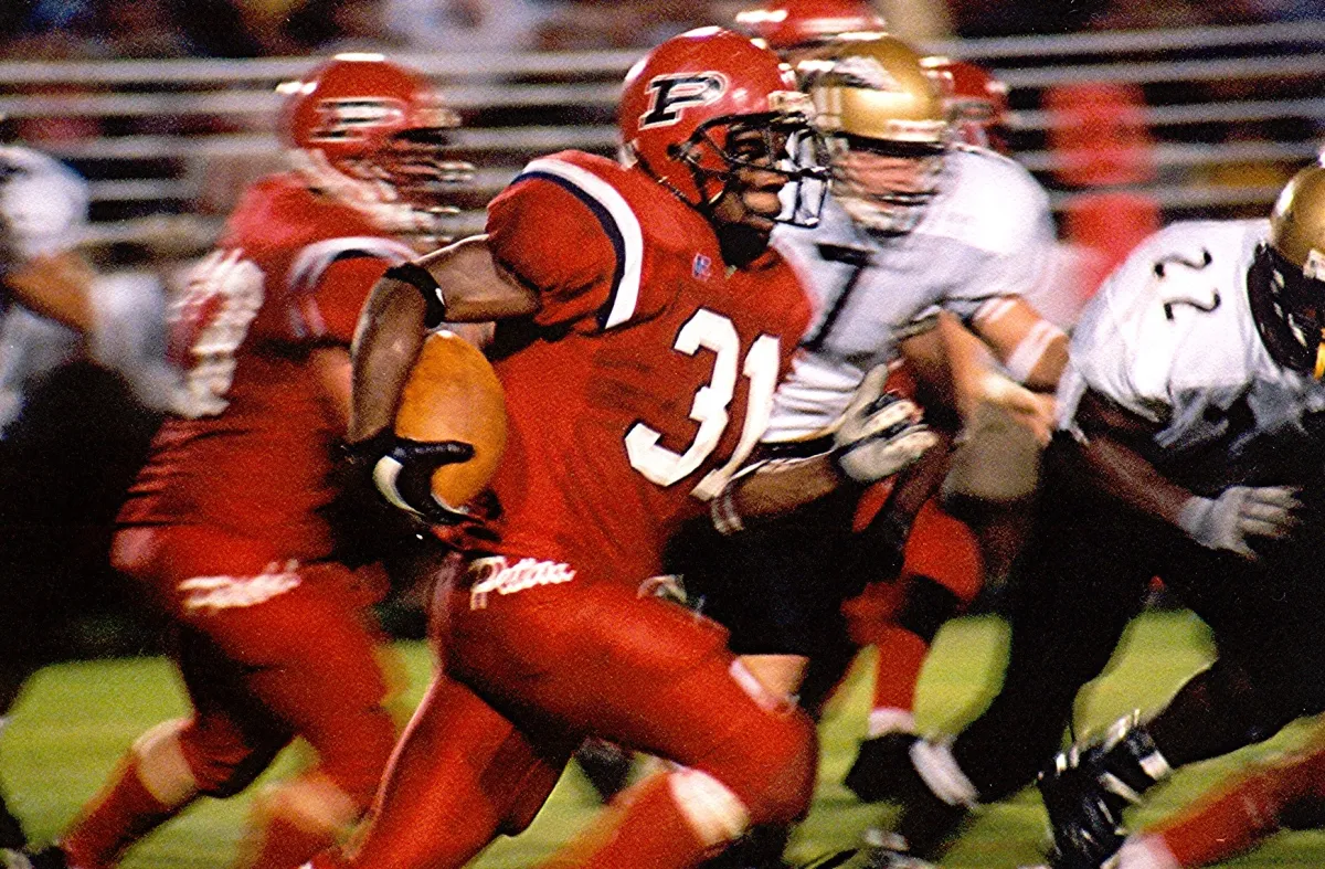 This picture shows the action at a Petal High School football game as the running back breaks through the line for a big gain.