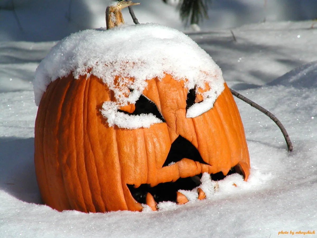 Winter arrived and covered this leftover Halloween pumpkin with snow.