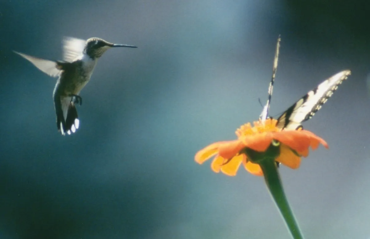 I was taking pictures of butterflies. When the humming bird appeared in one of the pictures.