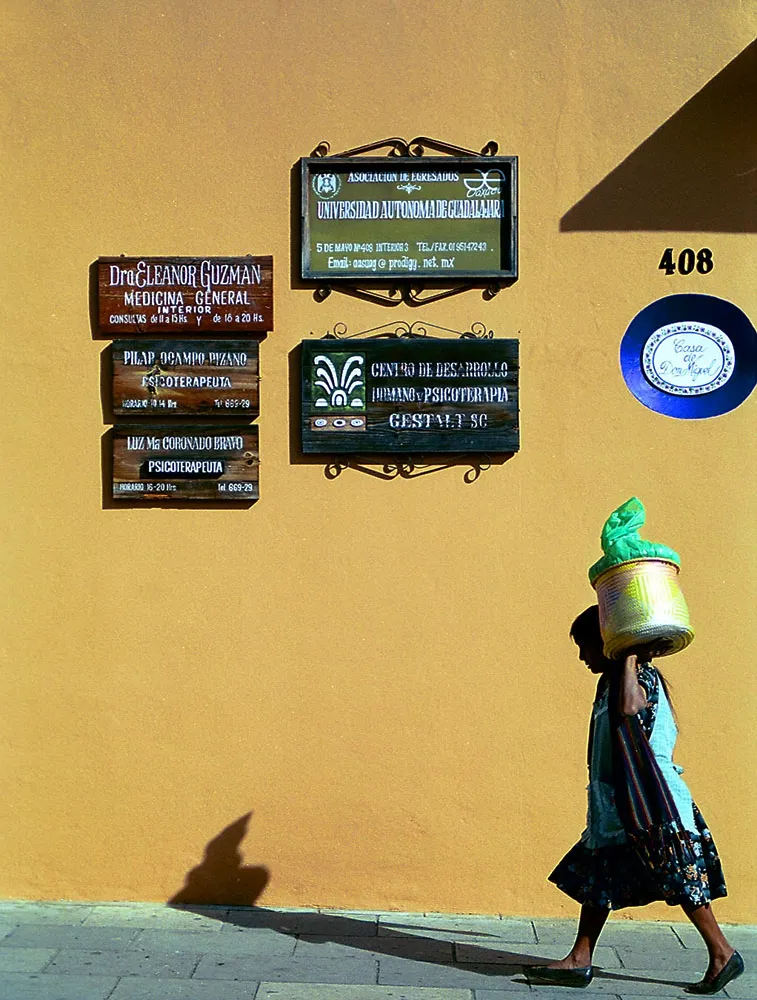 This picture was taken in Oaxaca, Mexico with Kodak Gold 200 film. I really liked that wall with the color, signs, and shadow. And I waited for several minutes until somebody walked by.