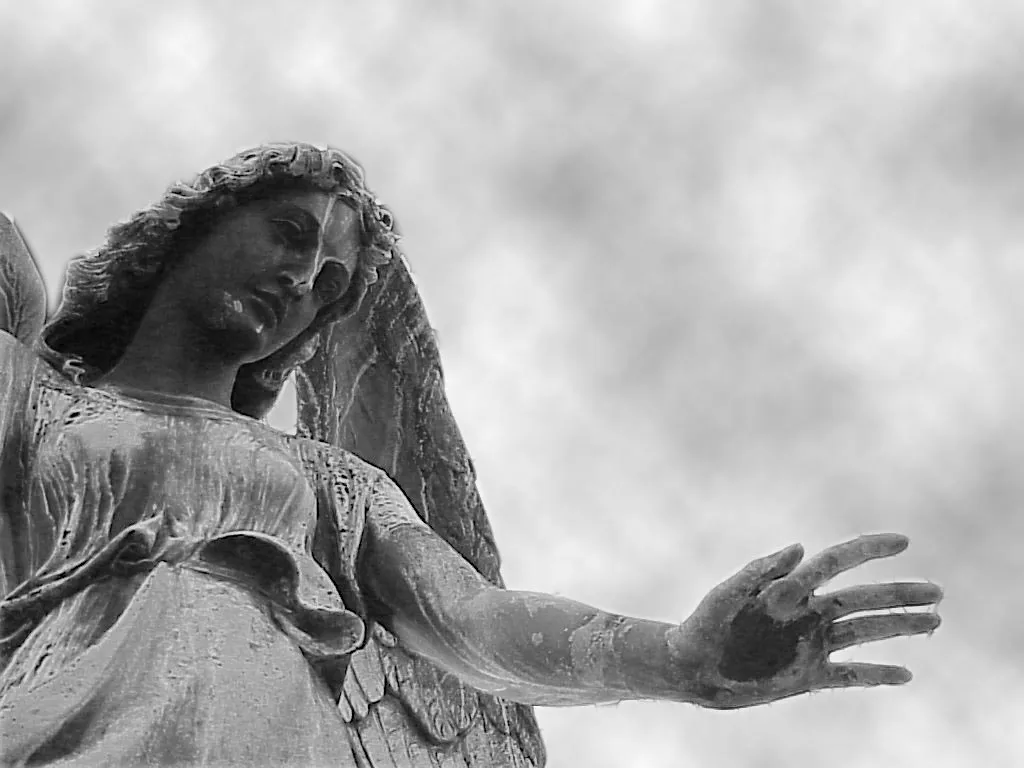 This angel guards a family plot in Cavalry Cemetery in Milwaukee, WI. This cemetery is the oldest extant Catholic cemetery in the city. I removed the trees from the background using Photoshop 7.0 and replaced them with clouds.