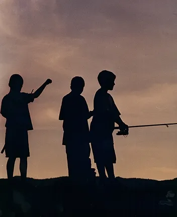 This is a picture of three boys fishing off of a rock, at the mouth of the Spokane River -- just where it meets Lake Coeur d'Alene, in Idaho.