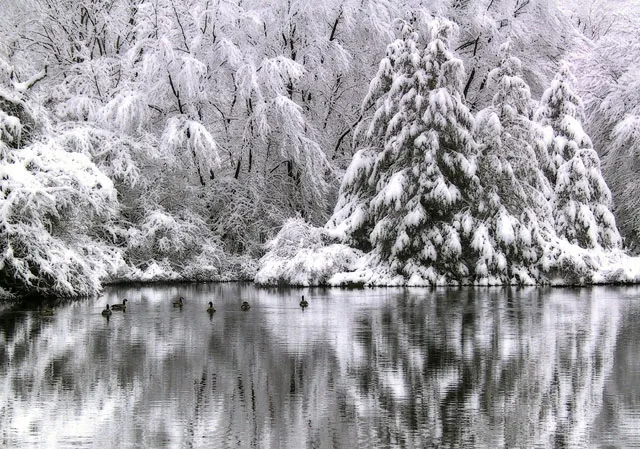 After our first snowfall in Conneticut last winter, I set out in my 4X4 in search of a scene that would reflect the beauty and magic of the season. I was fortunate to find this scene...trees heavy laden with snow and geese on this unfrozen pond.