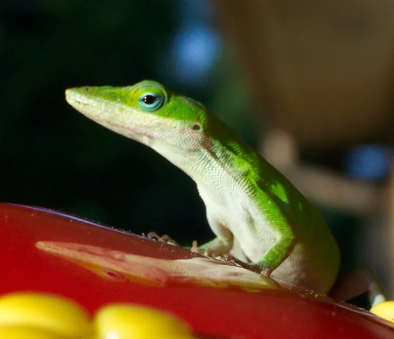 I love watching the hummingbirds at the feeder outside my patio door. They, however, are difficult to catch on film. So, I decided to try to get pictures of some of the creatures that raid the feeder. The lizards are there often, using their long tongues to drink from the holes. This one was very cooperative, allowing me to take several close-ups with my Kodak LS443 before jumping from the feeder to the house and scurrying off into the bushes. The picture was taken in July, 2003.