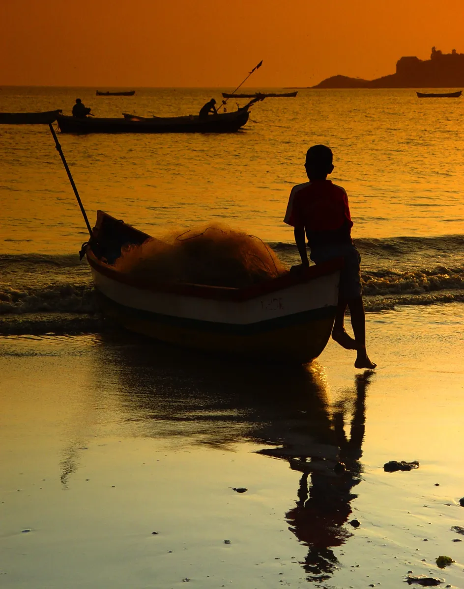 This picture was taken at Versova fisherman's coast, Mumbai, India. The boy was expecting his father to arrive after his daily work at sea. Others had already arrived. It was sunset time, 6:00 p.m.
