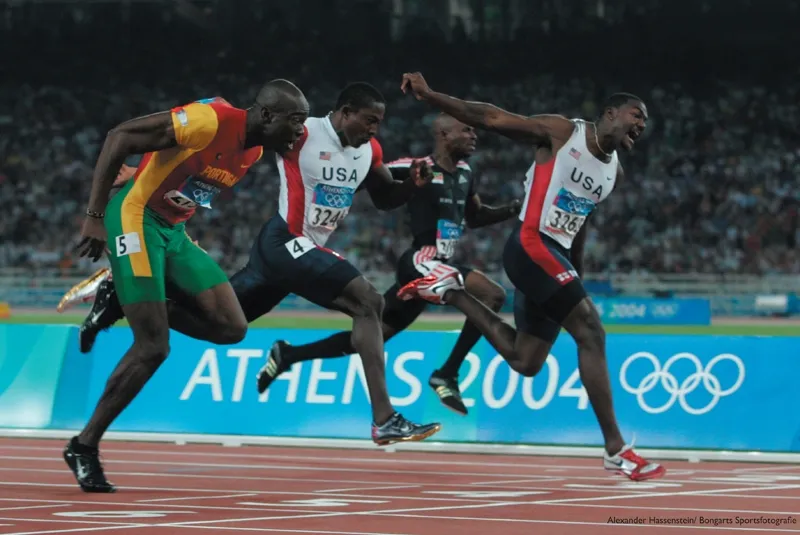Justin Gatlin of the USA edges Francis Obikwelu of Portugal and fellow countryman Maurice Greene to win Olympic Gold in the Men's 100 Meter Sprint Final.