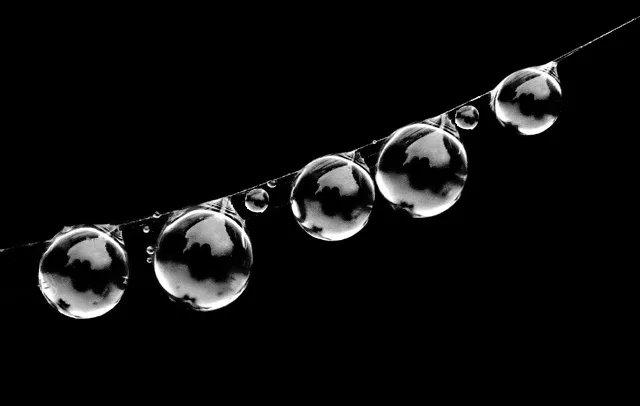 Image of a series or rain drops caught on a single spider web that I took in my front yard. I like it because of its starkness and simplicity. Like many things in nature, I think that the very simplest things often go unnoticed and underappreciated for the beauty that such scenes contribute to our environment. Maybe that's why they are so temporary and quick to disappear.