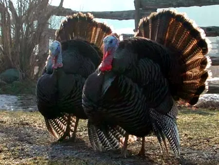 These are Darryl & Darryl, our pet wild turkeys who were hatched by one of our chickens. I took this early one misty morning -- I thought they looked so "handsome."
