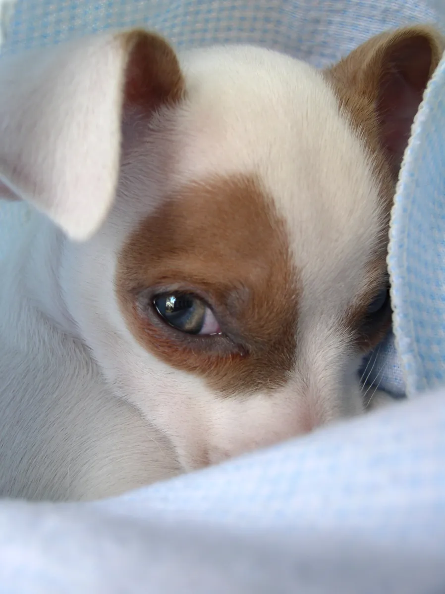 This is a pet portrait of a friends 6 week old Chihuahua. Made in the shade on our front porch. 1/125@f2.8 ISO100.