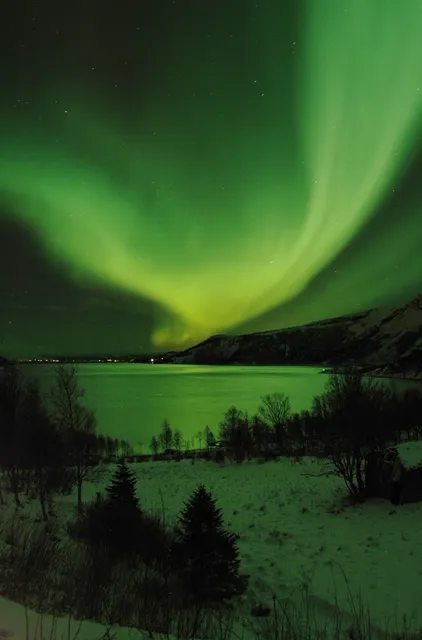 An extraordinary powerful northern lights over a Norwegian fiord in December 2005.