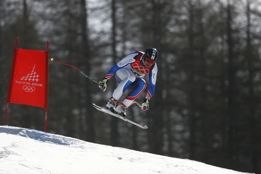 Antoine Deneriaz of France wins gold in the Mens Downhill Alpine Skiing Final in Sestriere Borgata, Italy. (Clive Mason/Getty Images)