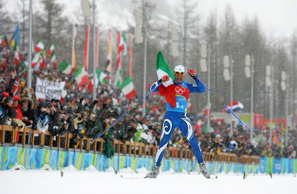 Cristian Zorzi from the Olympic host country Italy celebrates after crossing the line first helping his team win the gold in the Mens Cross Country Skiing 4x10km Relay event. In a relay the teams consist of four athletes, each of whom skis one leg of the race and then tags off to a team-mate. (Clive Mason/Getty Images)