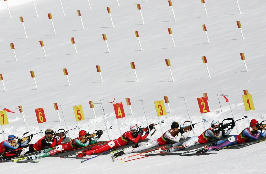 Competitors shoot in the Men's Biathlon 4x7.5km Relay. The German team won the gold, followed by Russia and France. The relay is a fast-paced team event in which four-person teams tackle four 7.5km legs. It begins with a mass start by the first skiers of their respective teams. Each team member has two firing sequences and is allowed three extra bullets (a total of eight) to hit five targets. For each target left standing, competitors ski a lap around the 150m penalty loop. (Jed Jacobsohn/Getty Images)