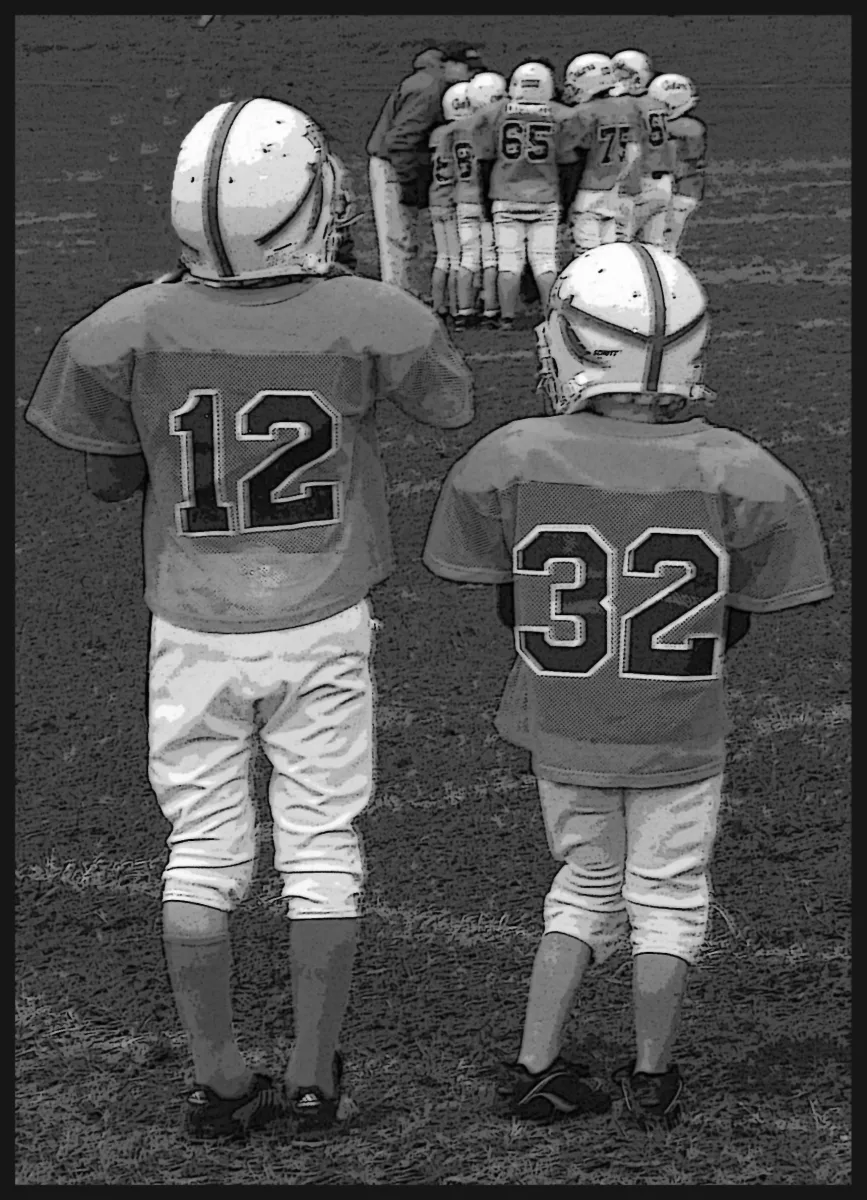 This is a picture of my 9 year old son and his teammate taking a short break from another winning game!! I love how they're watching the huddle in the background.