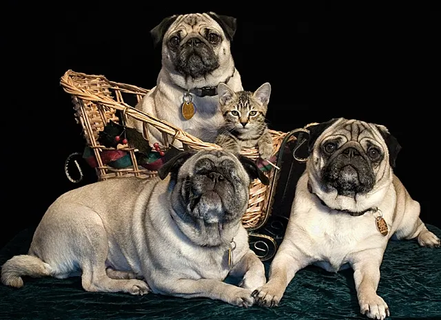 These are my fur-kids, who brighten each and every day. The front pug does not have eyes - she was rescued from a puppymill and due to horrid conditions, she lost her eyes.