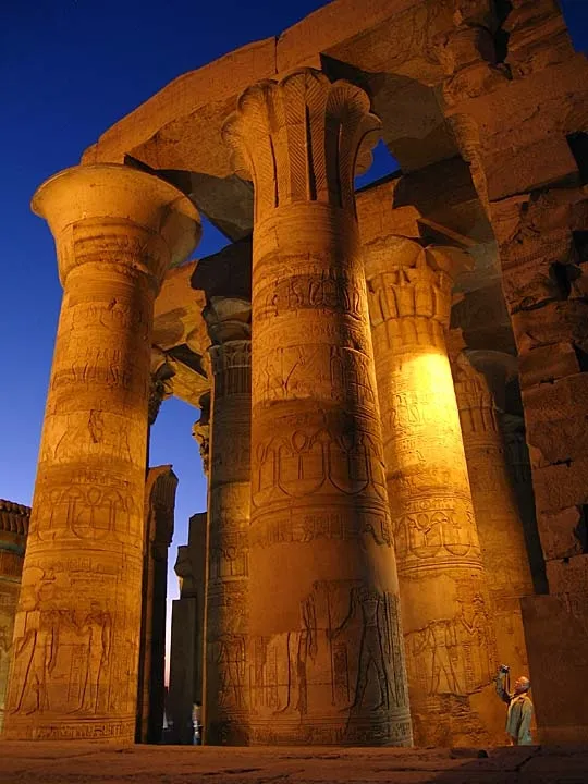This picture was taken at Kom-Ombu Temple, Egypt. When we reached the temple, the sun was already set but not totally dark. I was disappointed because there was not enough light for a decent picture. Before we left the lights were suddenly turned on and I got this picture. The photographer at the lower right hand corner made the pillars look even more magnificent.
