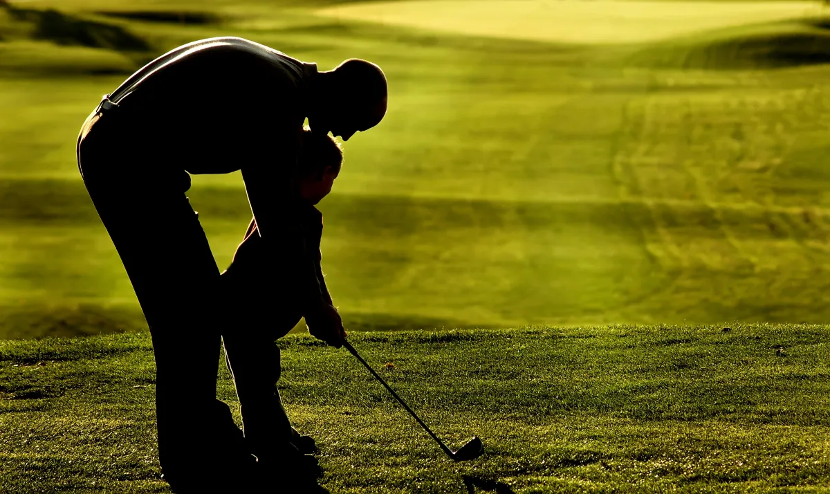 A special moment between a father & son. Teaching a child the elements of golf. Taken on a golf coarse at sunset.
