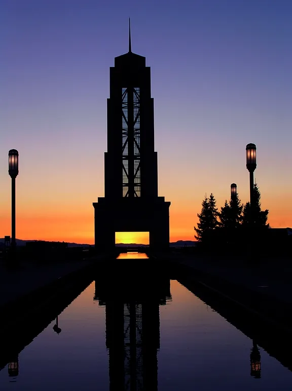 I took the picture in Salt Lake City. I saw the sun setting and tried to capture it right beneath this spire, and over the reflection pool. I love how the sunset turned out, the colors and the silhouette of the spire against the sunset.