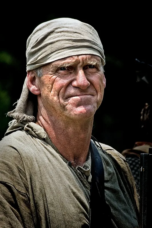 Historic Brattonsville, in South Carolina is a preserved 18th century farm, that was the site of a US Revolutionary War battle. Every year, there is a re-enactment of the Battle of Huck's Defeat. The re-enactors, such as this gentleman, fully emerse themselves in their roles.