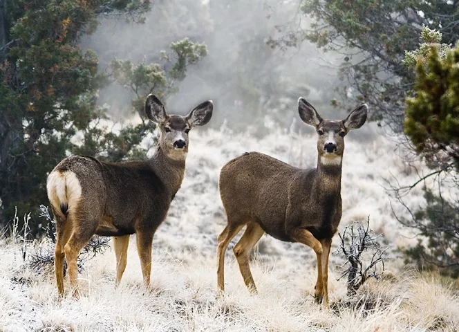 In the fall and winter there is often a lot of frozen fog in the mornings. I was lucky enough to catch these two moving through it.