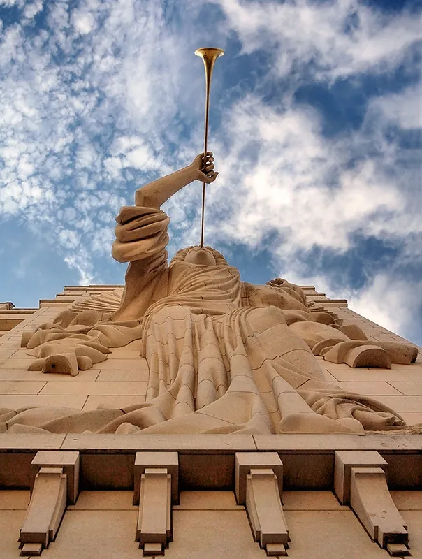 The Angel at Bass Hall has become an icon in Fort Worth Texas that represents the cities commitment to the Arts! I captured this image on a summer morning in 2007 when the big blue Texas sky was accented beautifully with wispy white clouds!