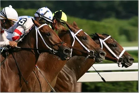 Horse racing at beautiful Saratoga Race Track in Saratoga Springs, NY. This was shot as the three horses reached the finish line...all in line. August 2007
