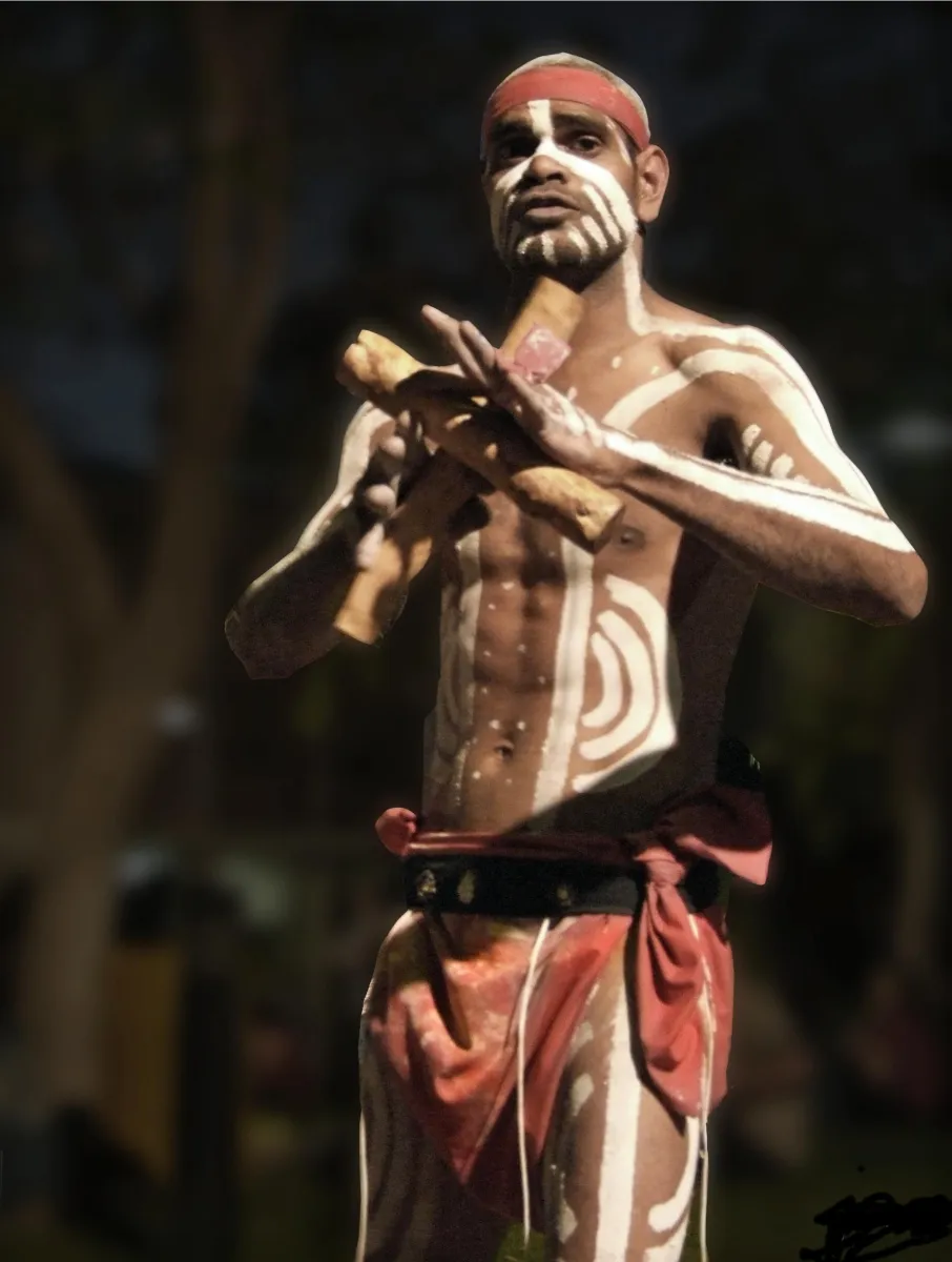 This aboriginal dancer is a typical dancer of Central Australia. I am from Holland and have lived in Alice Springs (Central Australia) for two years now. This man showed a ritual dance to honour the land we live in, walk on, and feed ourselves from. The blurriness adds to the mystique of the character, I think. EXIF details: unsure, handheld in darkness. Postprocessing: PS CS2, burn and sharpen