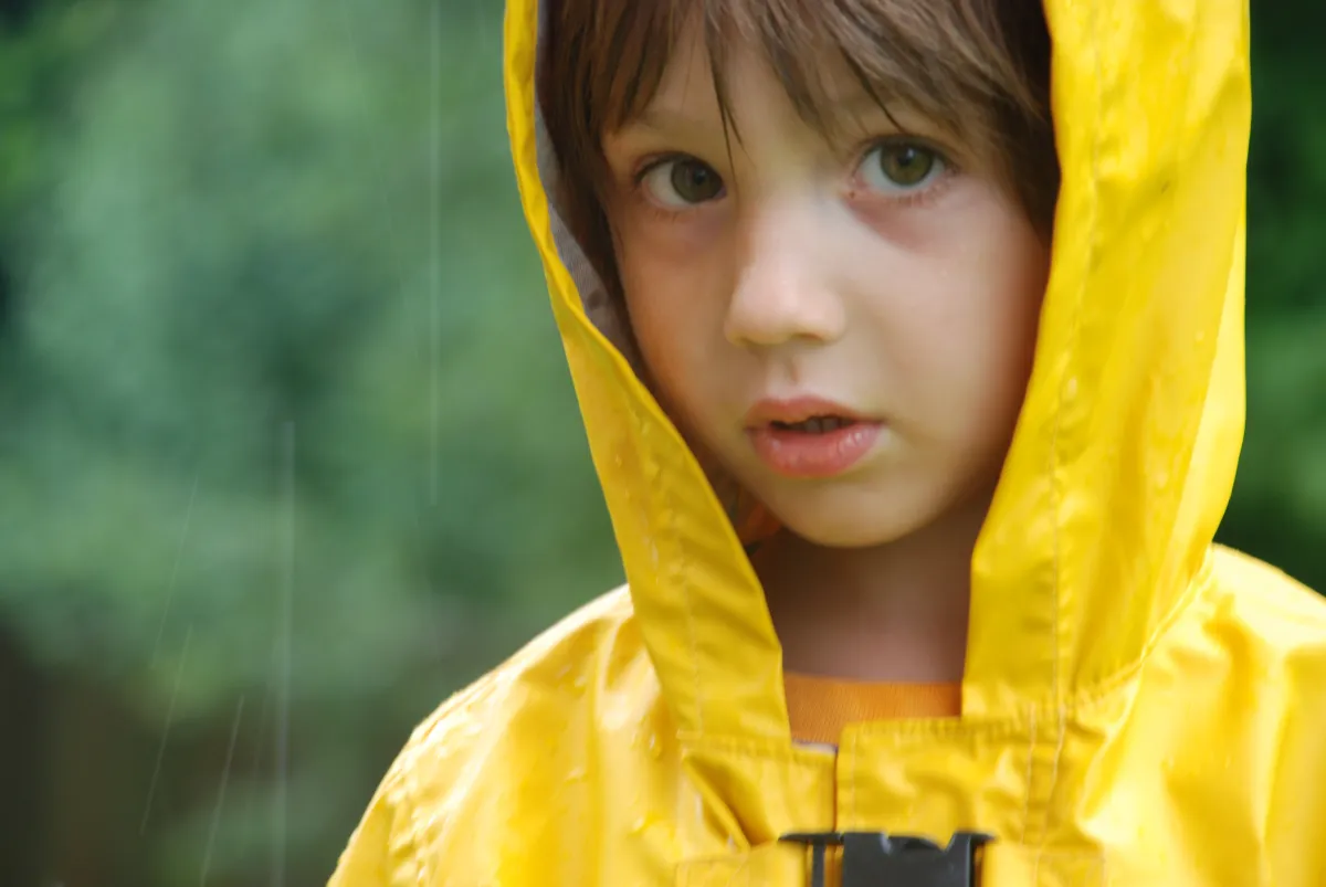 We had a rainy week from Tropical Storm Faye and my son loves to play outdoors, so I let him play in the rain with his raincoat. I just love his sad face here...