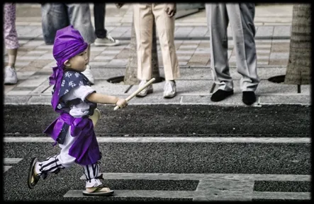 This snapshot was taken at a local festival in Okinawa, Japan. After a local cultural group had performed, they moved down the street. All of a sudden this little tyke, who had been performing with them, notices that they've moved on without him. He comes running down the street shouting "wait" at the top of his lungs to the applause and laughter of the crowd.