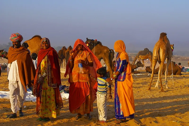 I saw the people in traditional colorful dress with a happy mood in golden hour in the morning. I liked the background with camels. It was captured in a village near Pushkar, Rajasthan, India.