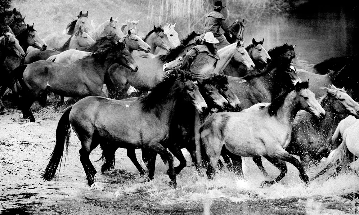 Horses being mustered through a creek at Glenworth Valley, Central Coast, NSW, Australia. Captured with Nikon D3X DSLR and Nikkor 70 - 200mm VR lens. I have converted the original RAW image with NIK Silver Efex. I've chosen Nature rather than Animals/Pets, as my category, because the image, to me, is not just about the horses themselves, it's about the raw nature of their actions/reactions, their interaction with drovers (musterers) and the environment, tones and textures in a cacophony of sound and energy.