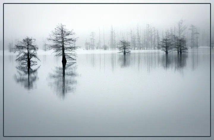 This is the closest representation of what I actually saw! This is a color photograph, but the January fog zapped most of the color from what the eye sees. Taken in January, 2009, Barksdale AFB, Shreveport, LA. For me, this is nature at it's most mysterious and beautiful state.
