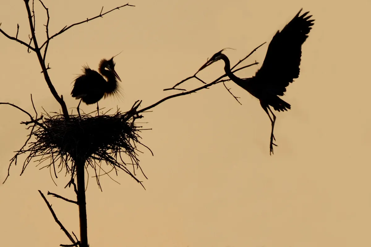 Great Blue Heron's nest building is nature at its best. The male gathers branches, gives them to the female who constructs the nest.