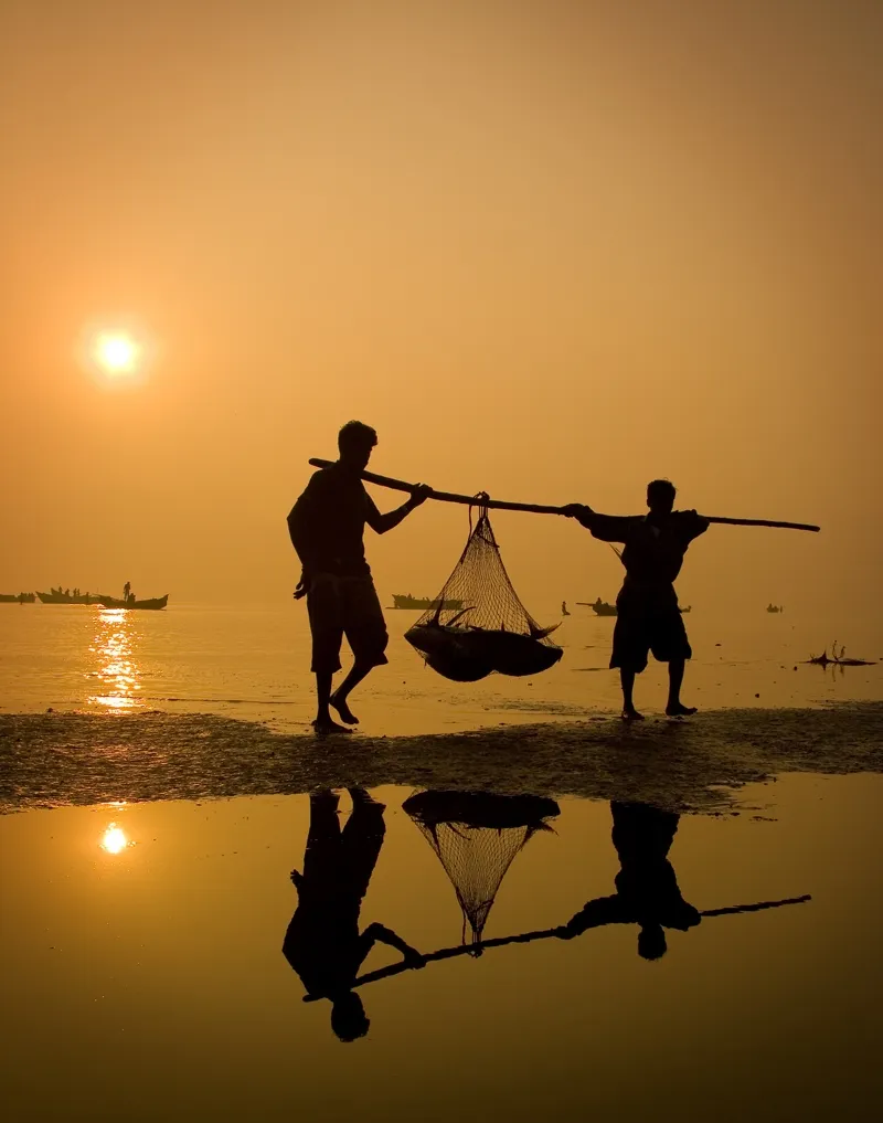 One fine early morning, I went to the beach with my camera to catch the lazy sunrise. My daily catch was very dull, but I found two fisher men with their good catch coming on shore. I started clicking, and luckily got this shot. The great shadows added the flavour.