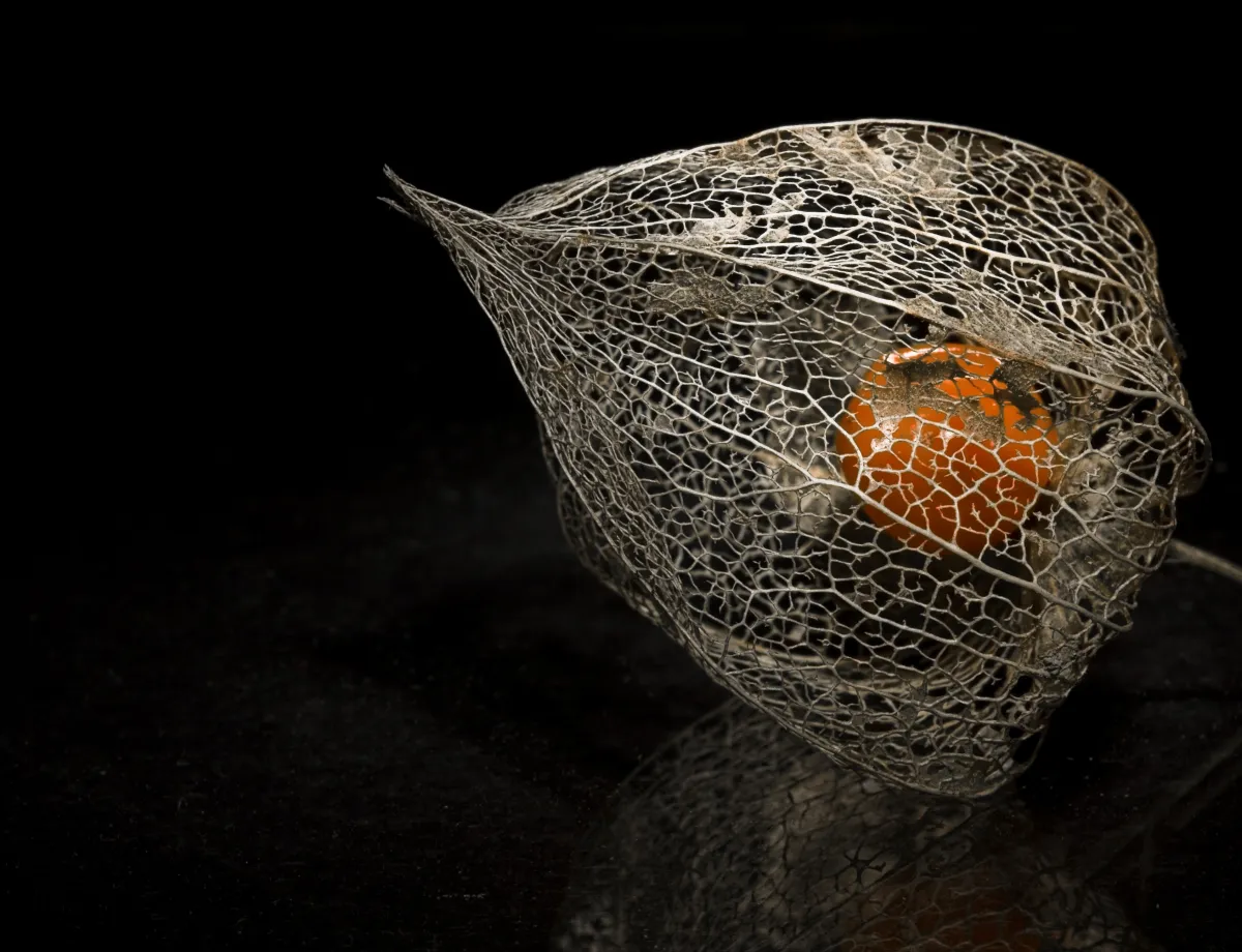 I was looking for something special to do with Chinese Lanterns, and while cleaning out a friend's garden I came across these - all withered and dried up. Immediately I thought of doing something creative with one of them and I took them to my basement studio. Using a glass bottom to get the reflection I started snapping away until I got the image that I wanted. I made minor contrast adjustments, but this is right out of the camera.