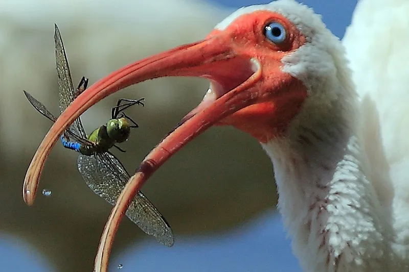 The diet of the White Ibis is diverse as shown by this dragonfly which is about to be consumed.