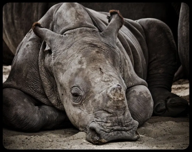 I took this close shot of a sleeping baby rhino in September 2010. It has a hot and humid day and he was napping next to his mother in a shady spot on the sand.