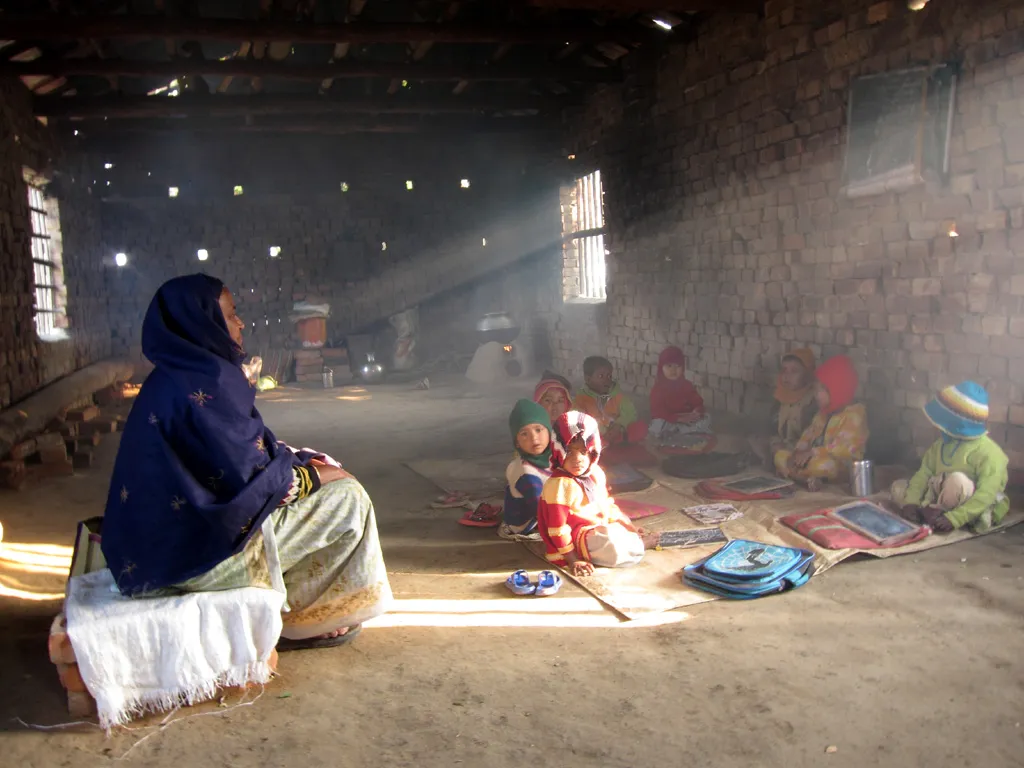Under the watchful eyes of their teacher tiny tots of Fakirchak village attends an Anganwadi center.