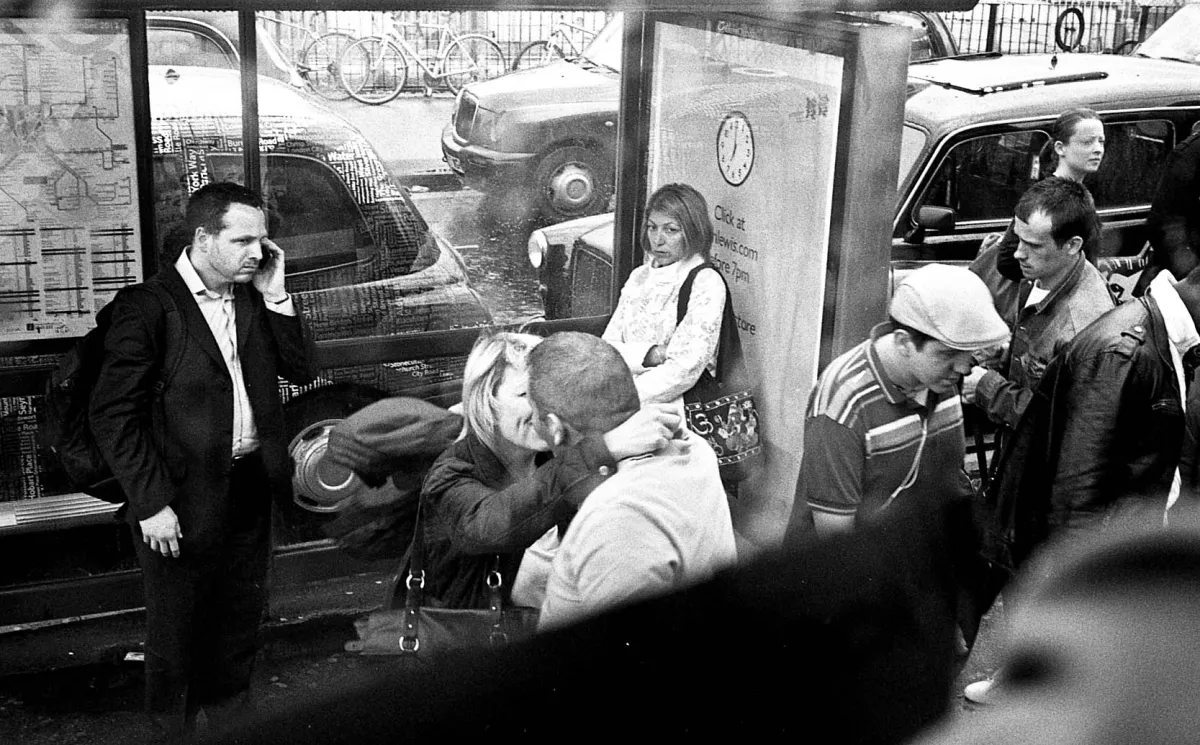 I took this photo when I visited London a couple of weeks ago. I went there on my own. I took it from the bus back to the airport. I like the two people who greet eachother with a kiss, maybe after not seeing each other for a while. The London cabs in the background and people looking at the couple. I find the photo captures a special moment. I visited London to meet fellow Film Photography Podcast listeners.