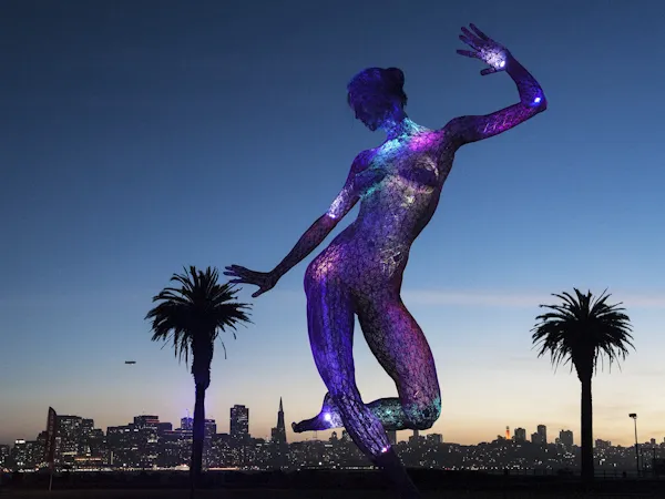 A forty foot statue on treasure island in the SF bay at sunset with the SF city skyline in the backround