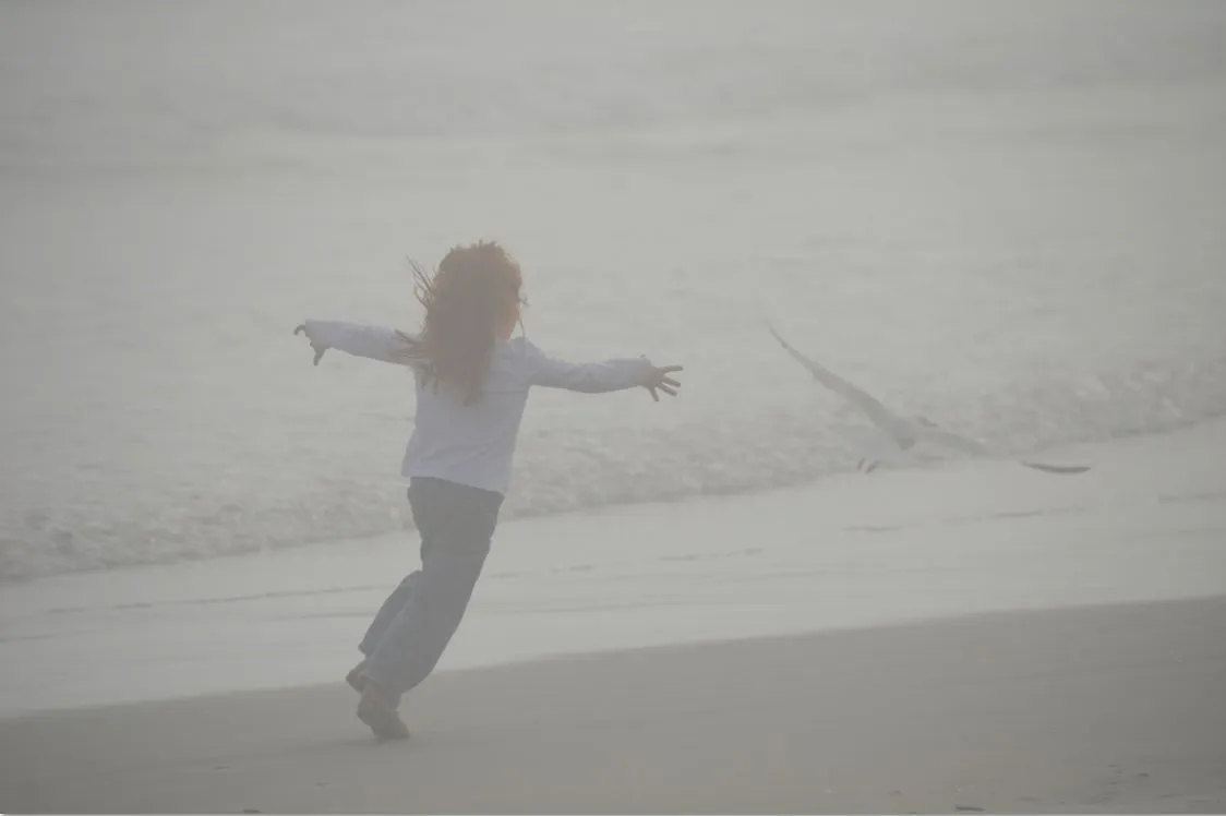 We were at the beach on a day with heavy sea fog and our daugher chased after some sea gulls.