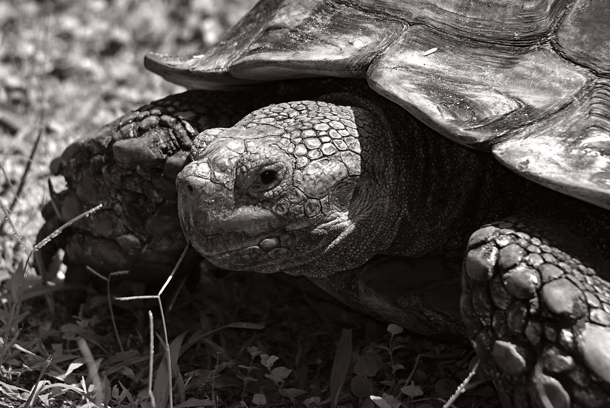 This is a Gopher Tortoise found in the southern states. They dig their burrows in dry habitats and can live over a century. Captured at Flamingo Gardens in Davie. Florida.