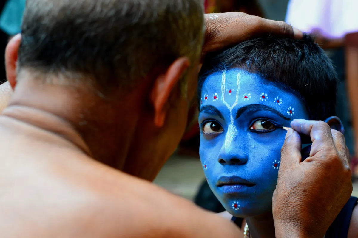 Chameleon is very famous mostly in village. These mainly seen in the rural fair in each an evry occassion.They makeup like Hindu God and Godess and act like them and entertain people through their acting. I capture one of this moment when a boy took some final touch.