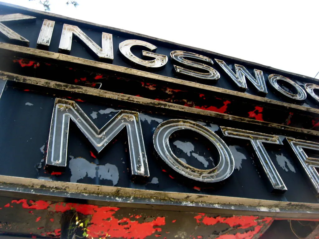 This photo was taken in Perry Florida at what was once the Kingswood Motel. It has been closed now for years, yet the signs still stand proudly.
