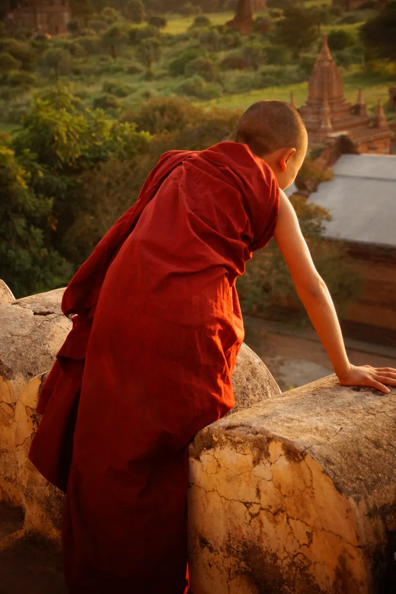 Sunset at the Shwe San Taw pagoda in Bagan, Myanmar. This little monk was kind enough to show up. I took the picture and before I had the time to thank him he was already gone.