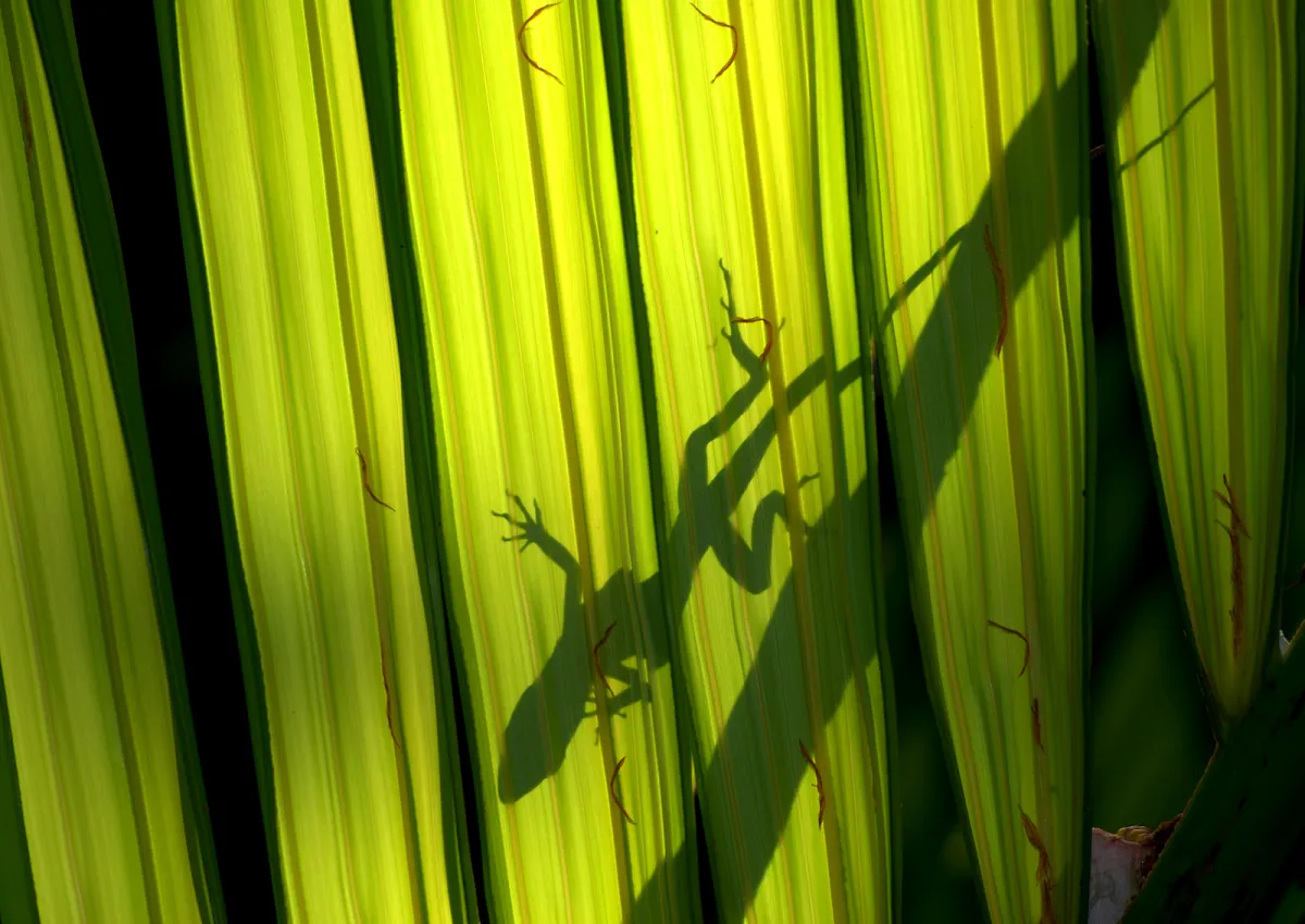 The silhouette from a large lizard over a tropical leaf.