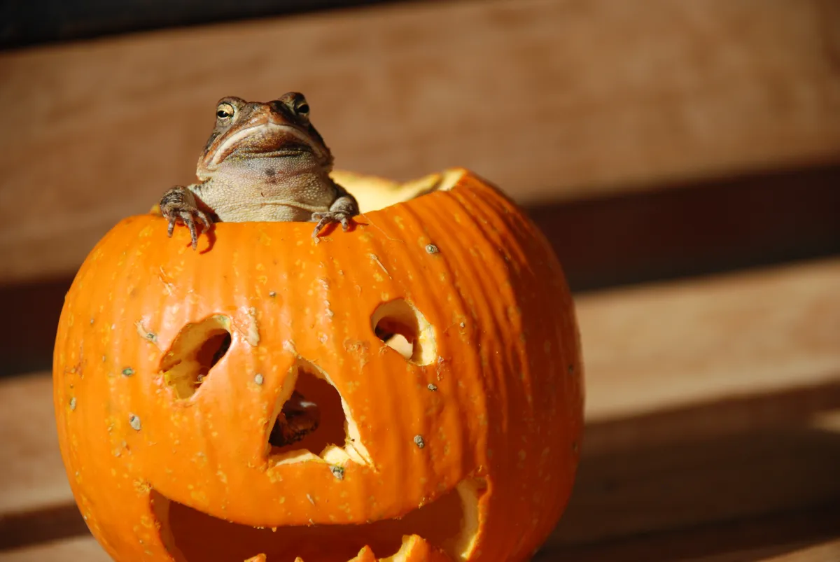 We carved out pumpkin and had it on the porch when an unexpected friend "Mr.Toad" decided it looked like a nice hiding place. Gotta love frogs and toads right!