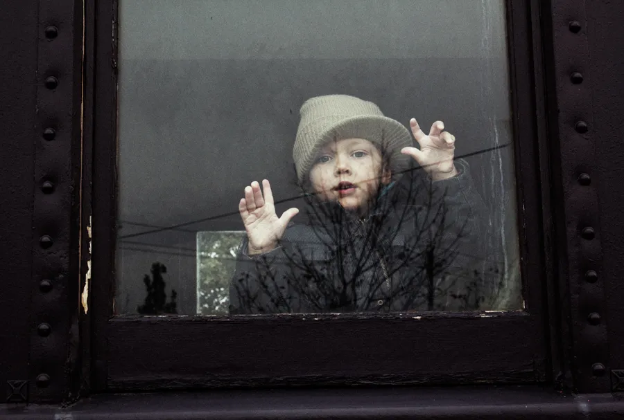 A child full of wonderment looks out a seemingly timeless window of the Heritage Number 9 Waterloo Central Railway Steam Train as it heedfully reaches it's destination at Waterloo station, in Kitchener-Waterloo, Ontario, Canada.