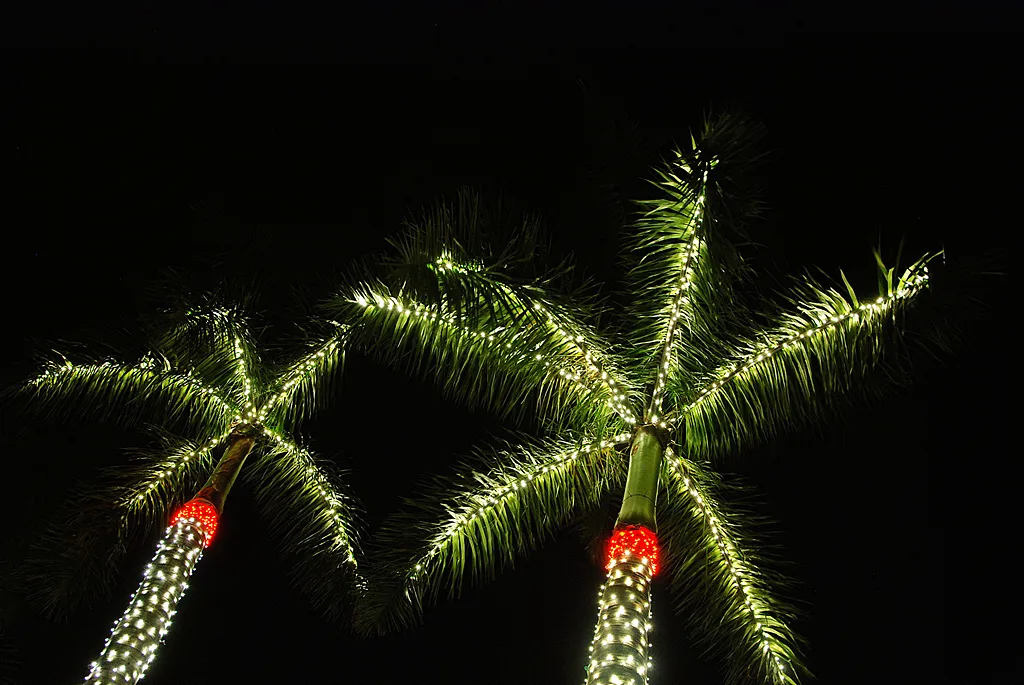 Holiday lights seen in South Florida palm trees.