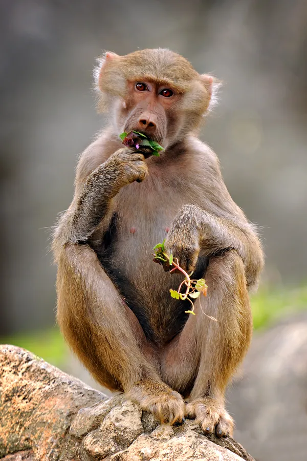 This young baboon, at the North Carolina Zoo in Asheboro, North Carolina, seemed to really be enjoying the local vegitation.